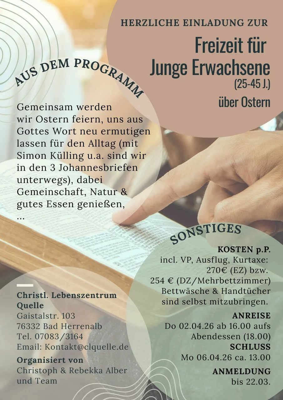 Auf den ersten Seiten möchten wir Ihnen einen Überblick über unsere Angebote geben. Wir freuen uns wenn Sie dabei sind mit uns gemeinsame Stunden unter Gottes Wort zu verbringen und Gemeinschaft zu haben.